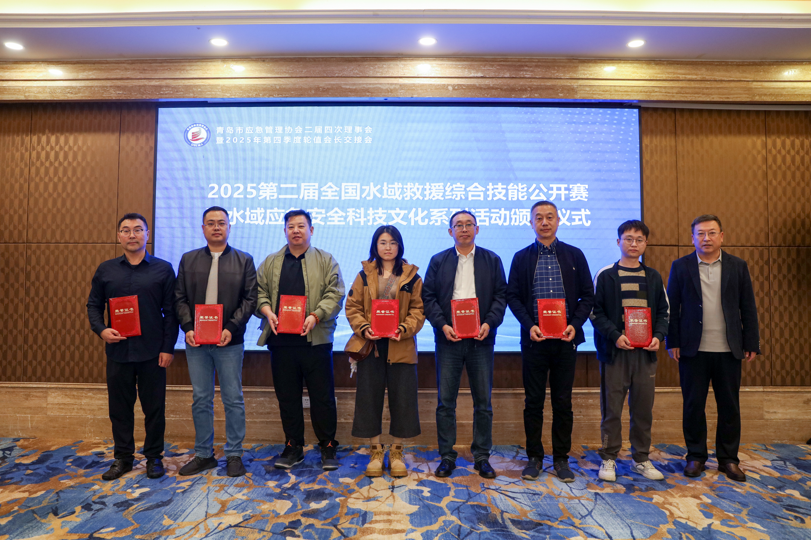 副会长张恩民为青岛峻海物联科技有限公司(左三)等公司颁发“2025第二届全国水域救援综合技能公开赛暨水域应急安全科技文化系列活动突出贡献奖”。