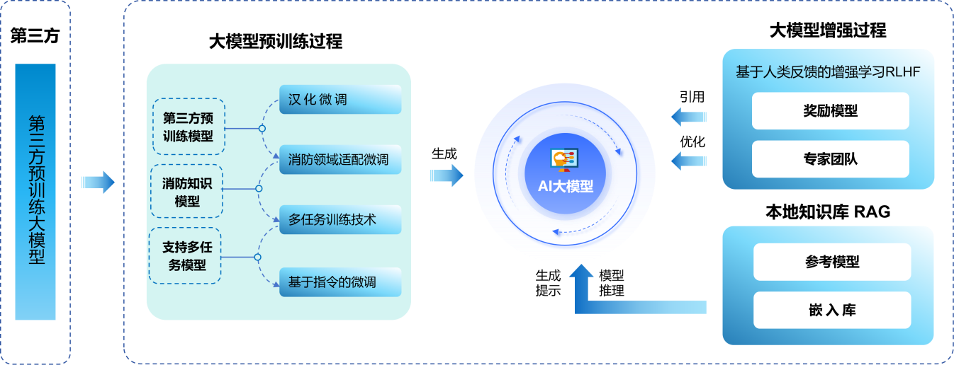 该模型基于图像识别、深度语义理解和跨模态关联分析技术构建,其逻辑架构围绕“预训练-微调-增强-推理”四大核心阶段,通过“垂直优化+持续学习”的技术路径,填补了智慧消防领域在自进化能力上的空白。