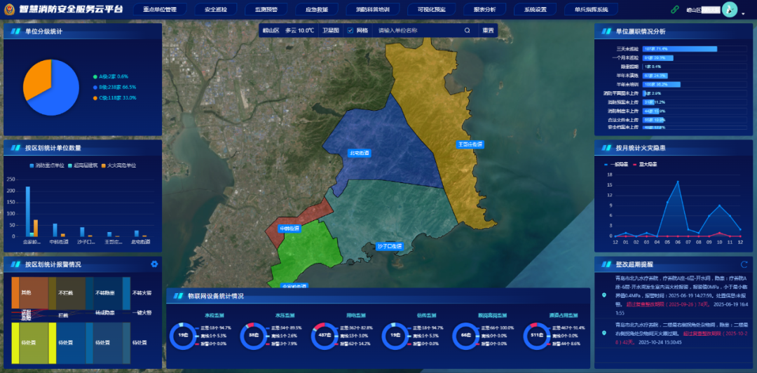 崂山区高层建筑密集,现有高层建筑1303栋,其中超高层(100米以上)18栋,重点消防单位345家。2024年,在区电子政务和大数据中心统筹下,高层建筑“智慧消防安全服务云平台”正式立项建设,旨在构建覆盖“感知、预警、调度和处置”的全链条智慧消防体系。
